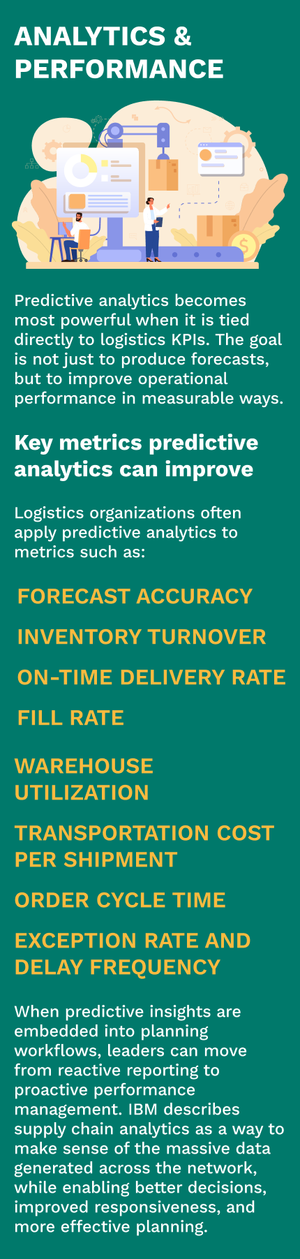Inventory is one of the costliest pressure points in the supply chain. Predictive analytics helps logistics teams determine where inventory should sit, how much safety stock is necessary, and when replenishment should occur based on likely demand and risk signals. This improves working capital efficiency while supporting order fill rates and customer expectations. IBM notes that AI inventory management supports accuracy, cost savings, and customer satisfaction, all of which are core logistics performance goals.