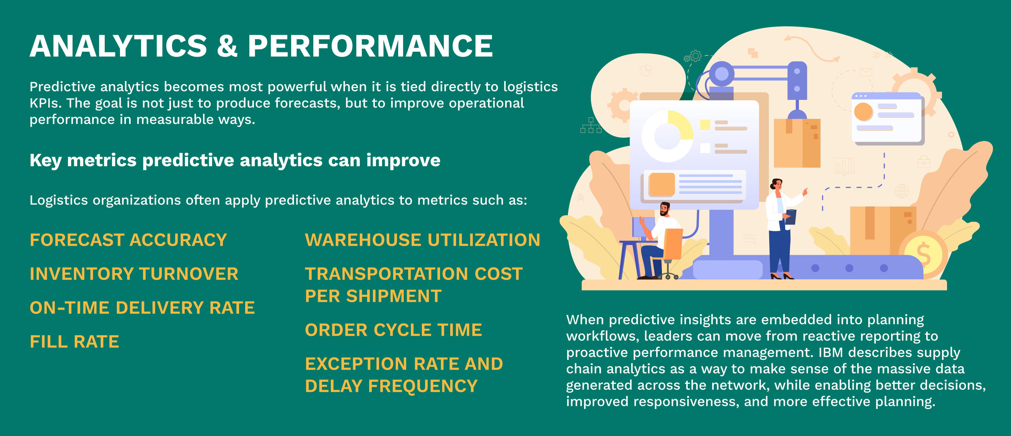 Predictive analytics is especially valuable when supply chains face volatility. Weather events, port congestion, labor shortages, supplier issues, and demand swings can all affect logistics performance. Predictive tools help teams spot patterns early, model alternatives, and build contingency plans before service levels are affected. McKinsey’s recent work on digital twins and AI-enabled supply chain planning highlights how predictive capabilities can improve efficiency and resilience across forecasting, sourcing, and supply planning.