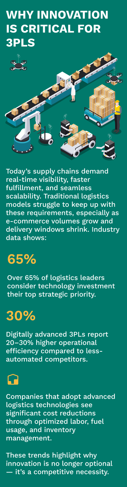 The next wave of 3PL innovation is reshaping logistics from the ground up. Emerging technologies — including AI, robotics, IoT, advanced analytics, and blockchain — are enabling faster, smarter, and more cost-efficient supply chains.